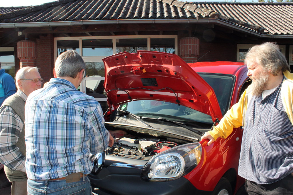 Foto: Akteure aus dem Aller-Leine-Tal werfen einen Blick unter die Motorhaube des Elektro-Autos des Tagungshauses Drübberholz aus Dörverden.