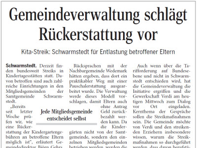 Derzeit finden bundesweit Streiks in Kindertagesstätten (Kitas) statt. Hiervon betroffen sind auch Einrichtungen in den Mitgliedsgemeinden der Samtgemeinde Schwarmstedt. „Bereits seit letzter Woche prüfen wir, wie eine Rückerstattung der Kindergartengebühren an betroffene Eltern möglich ist.