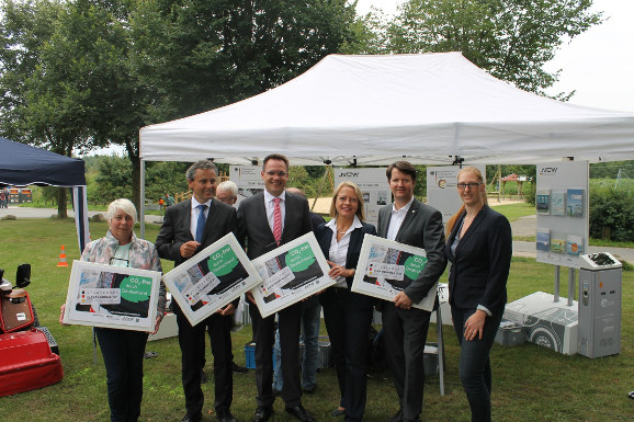 Claudia Schiesgeries, Cort-Brün Voige, Alexander von Seggern, Kathrin Rösel, Carsten Niemann und Silke Wilhelm (von links) freuen sich über den Infokoffer "Starterset Elektromobilität"