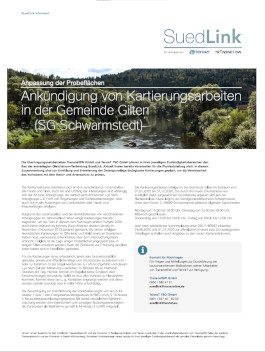 Die Berechtigung zur Durchführung der Vorarbeiten ergibt sich aus § 44 Absatz 1 Satz 1 des Energiewirtschaftsgesetzes (EnWG) i.V.m. § 18 Absatz 5 Netzausbaubeschleunigungsgesetz Übertragungsnetz (NABEG). Mit dieser ortsüblichen Bekanntmachung werden den Eigentümern und sonstigen Nutzungsberechtigten die Vorarbeiten als Maßnahme gemäß § 44 Absatz 2 EnWG mitgeteilt. Die Kartierungsarbeiten erfolgen in der Gemeinde Gilten im Zeitraum vom 01.01.2020 bis 31.12.2020. Die durch die neuen Erkenntnisse nun zusätzlich dafür vorgesehenen Grundstücke ergeben sich aus der Flurstücksliste. Diese liegt in der