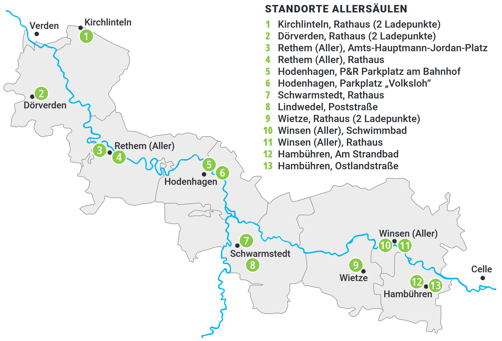 Standorte der Ladesäulen im Aller-Leine-Tal