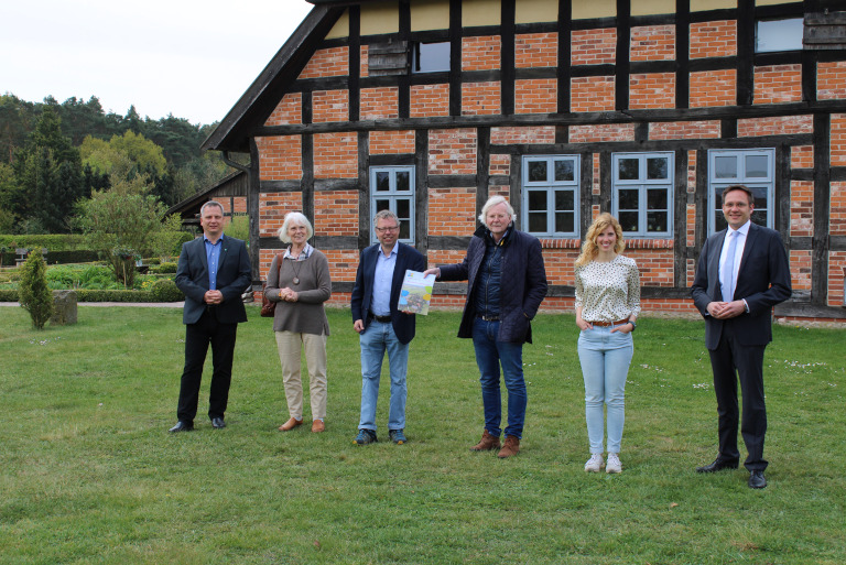 Übergabe des Regionalen Entwicklungskonzeptes durch Björn Gehrs, Samtgemeindebürgermeister Björn Symank (Samtgemeinde Rethem/Aller), Ulrike Rusack (stellvertretende LAG-Vorsitzende), Lisa Hitzmann (KoRiS) und Bürgermeister Alexander von Seggern (Gemeinde Dörverden) an Siegfried Dierken, Dezernatsleiter im Amt für regionale Landesentwicklung Lüneburg, Geschäftsstelle Verden im April 2022 auf dem Kulturgut Ehmken Hoff in Dörverden