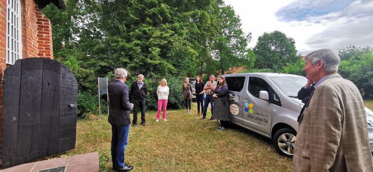 Die LAG-Mitglieder vor der Kapelle Bothmer und dem eDORFladenAUTO aus Otersen auf ihrer Exkursion zu LEADER-Projekten im Westen des Aller-Leine-Tals