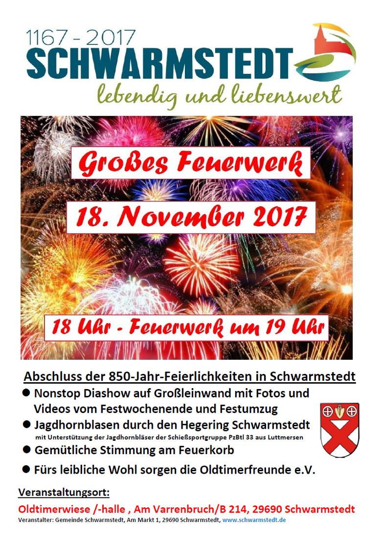 Das ausgefallene Feuerwerk vom Festwochenende wird am Samstag, den 18. November 2017 auf der Oldtimerwiese/-halle am Varrenbruch/B 214 um 19 Uhr nachgeholt. Nach dem Zapfenstreich vom 21.10. 2017 beendet das Feuerwerk dann die Feierlichkeiten zur 850-Jahr-Feier. Den Schlusspunkt setzt dann allerdings noch am 19.11. 2017 um 18 Uhr der Knabenchor aus Hannover in der St. Laurentius Kirche zu Schwarmstedt.